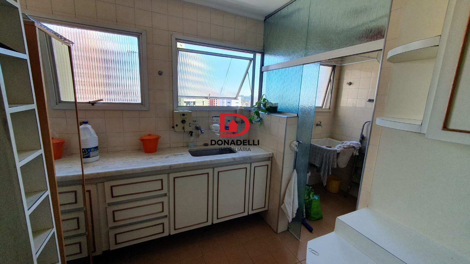 Cozinha ampla com janelas e armários. Área de serviço independente. 1 vaga.