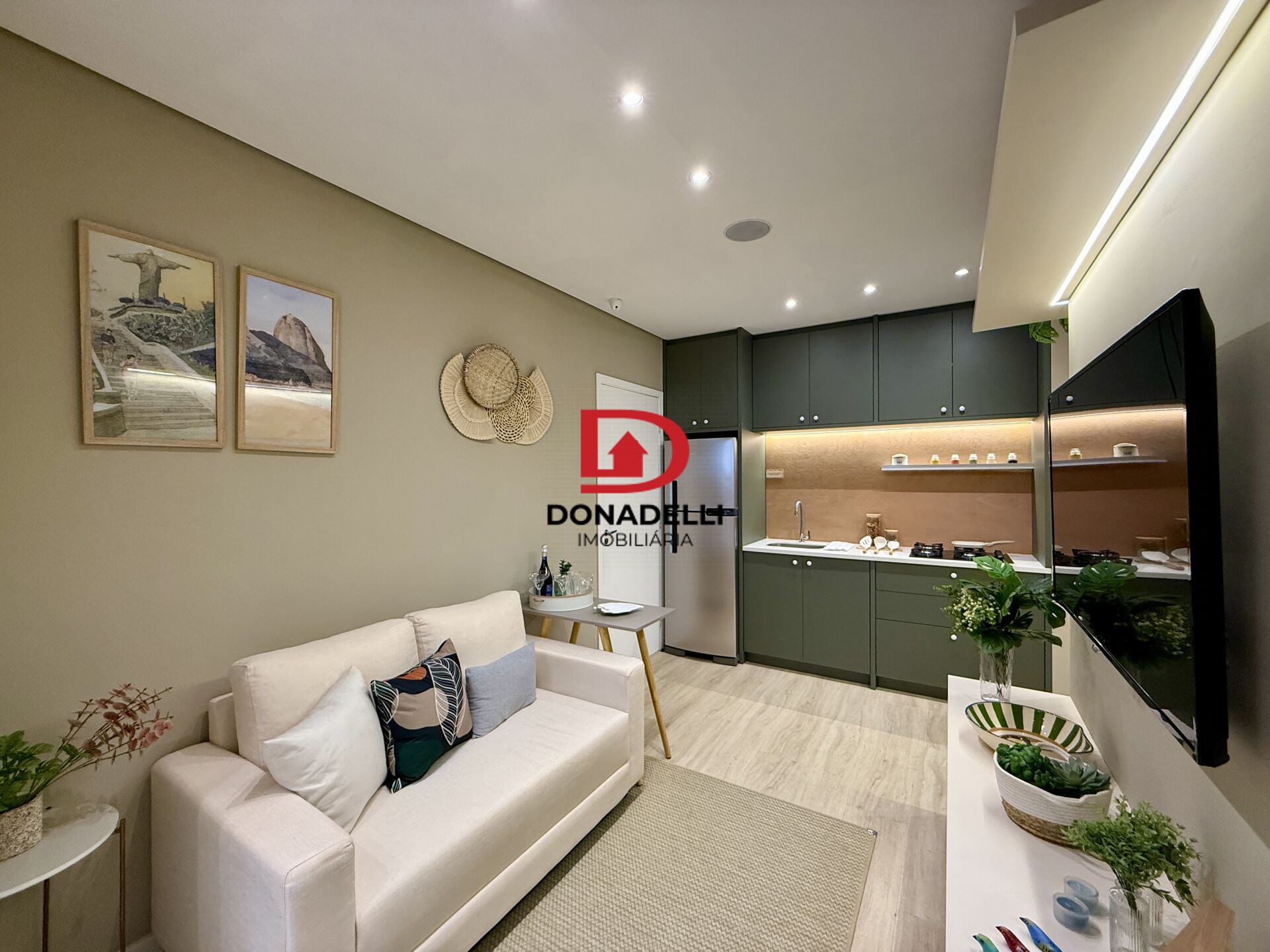 Tipologia das unidades: Apartamentos de 1 e 2 dormitórios e studios, com áreas privativas de 17 m² a 35 m², sem vaga.