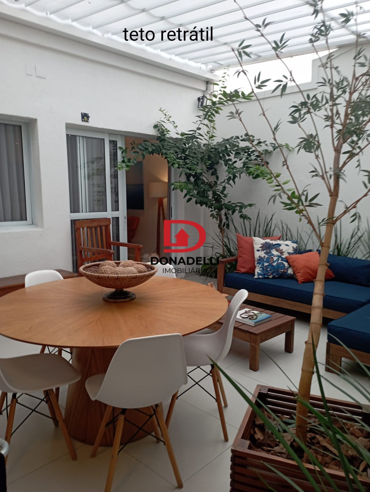 Quintal com churrasqueira e cobertura retrátil. Sistema de câmeras e monitoramento de alarme de segurança.
